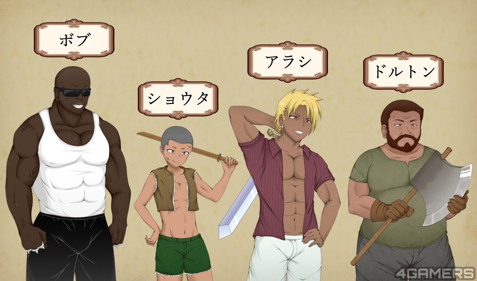 岛上有四个小王準备对露娜出手:多毛髒髒大叔道尔顿(ドルトン)、歪果黑人壮汉鲍勃(ボブ)、金髮渣男岚(アラシ)、小屁孩秀太(ショウタ,其实就是正太)。这四位小王或许手段不同,但目标一致都是让露娜成为他们的胯下玩物。
