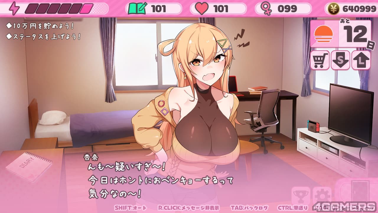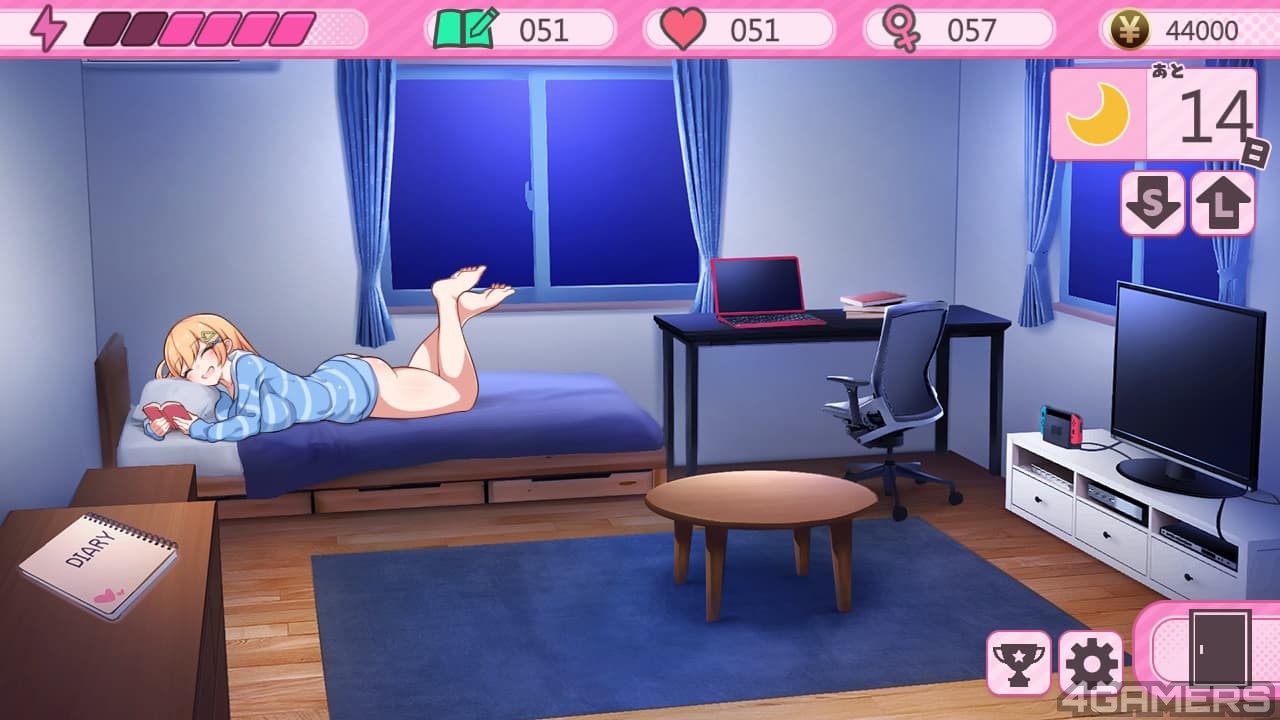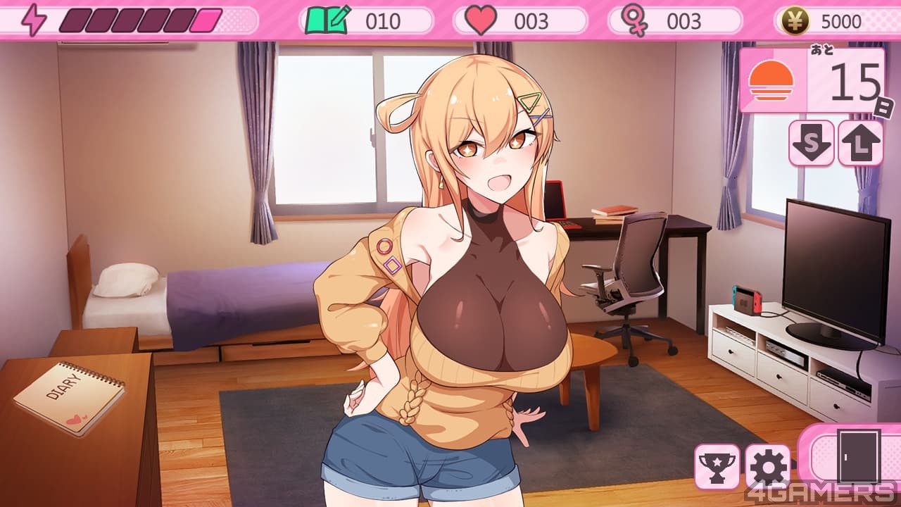 四次的行动中,玩家可以选择待在家里学习提高「知识」,或是和杏奈玩游戏提高「爱情」,也可以在晚上和她做些色色的事情;不过三种行动会互相影响数值,例如学习会降低爱情,色色和玩游戏会分别提高 H 度和爱情,同时也会让知识降低。