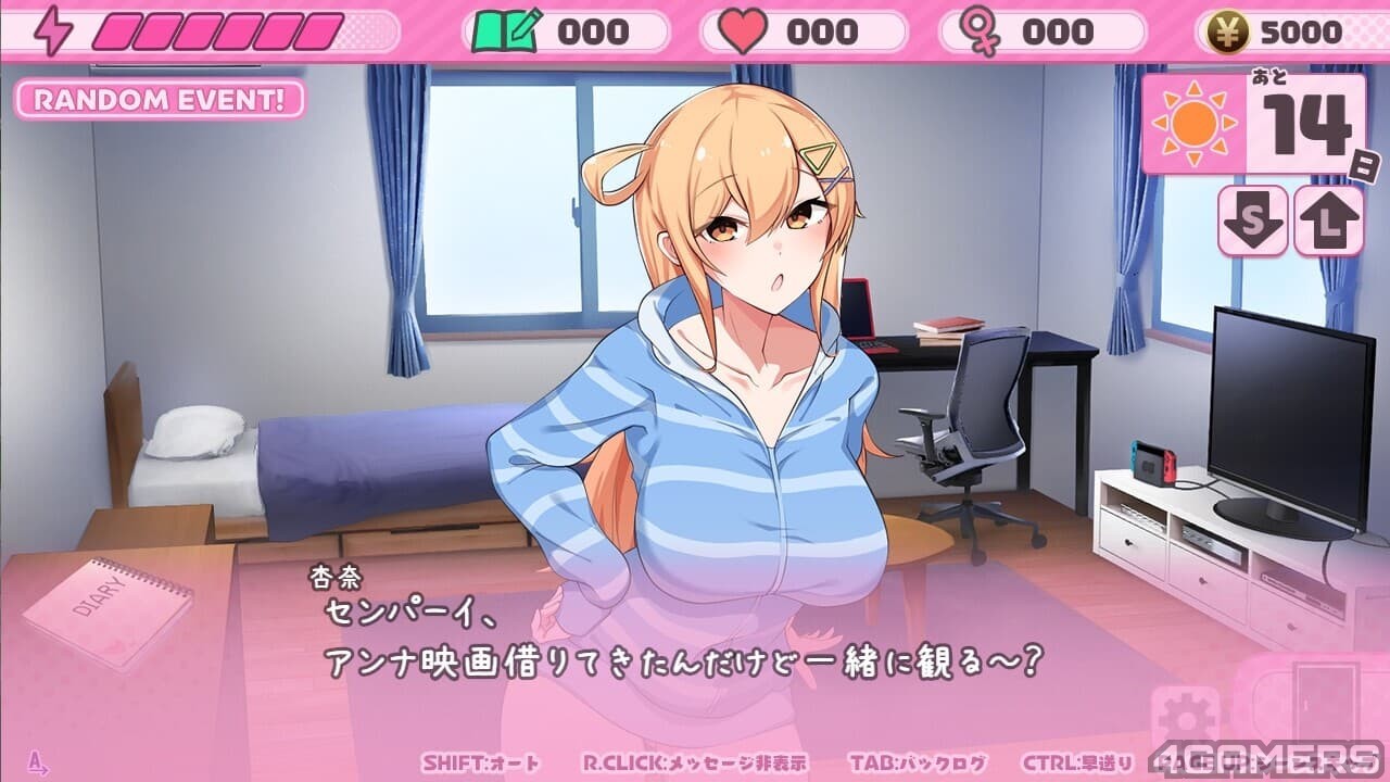 每一项数值除了会影响产生的事件外,也会根据玩家的各项数值高低导向不同结局。游戏提供超过 100 种事件等着玩家触发,从这些事件当中能够更了解杏奈,也能被甜蜜的情侣互动所疗癒或是被塞满满口狗粮。