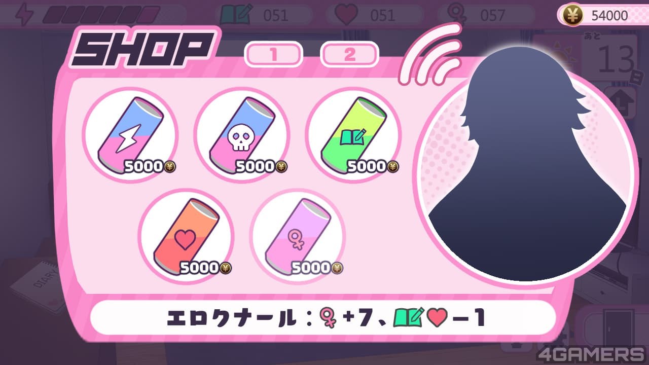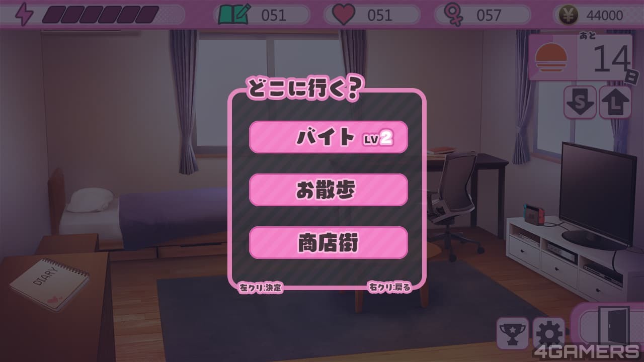 如果选择外出则可以进行打工、散步、和杏奈逛商店街三种。打工主要是为了赚钱约会以及从线上商店买些提升属性和体力的道具;
