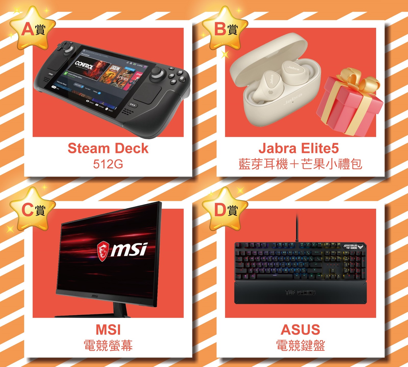 【芒果一番赏】玩家可以 1 抽 300 元(1000/4抽、2000/10抽)试试手气,也能透过体验芒果游戏完成任务集点免费参加,一番赏大奖包括 Steam Deck、MSI 电竞萤幕、ASUS 电竞键盘等。