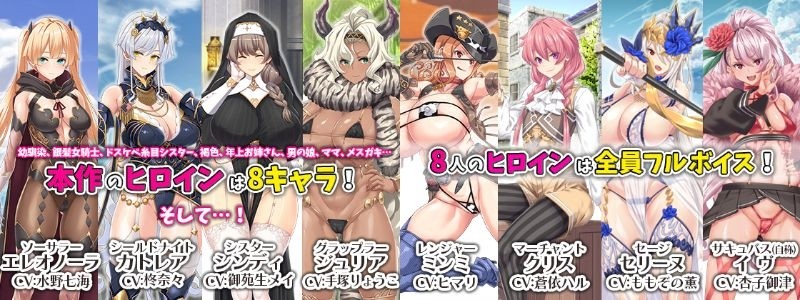 而游戏里的伙伴属性相当鲜明,从青梅竹马的伙伴魔法师、银髮巨乳女骑士、好色修女、野性黑肉丛林战士、令人小头错乱的伪娘、宠满母性的「大」贤者、乳牛比基尼装的活泼大姐、到雌小鬼系的淫魔,共 8 名女主角任君享用。