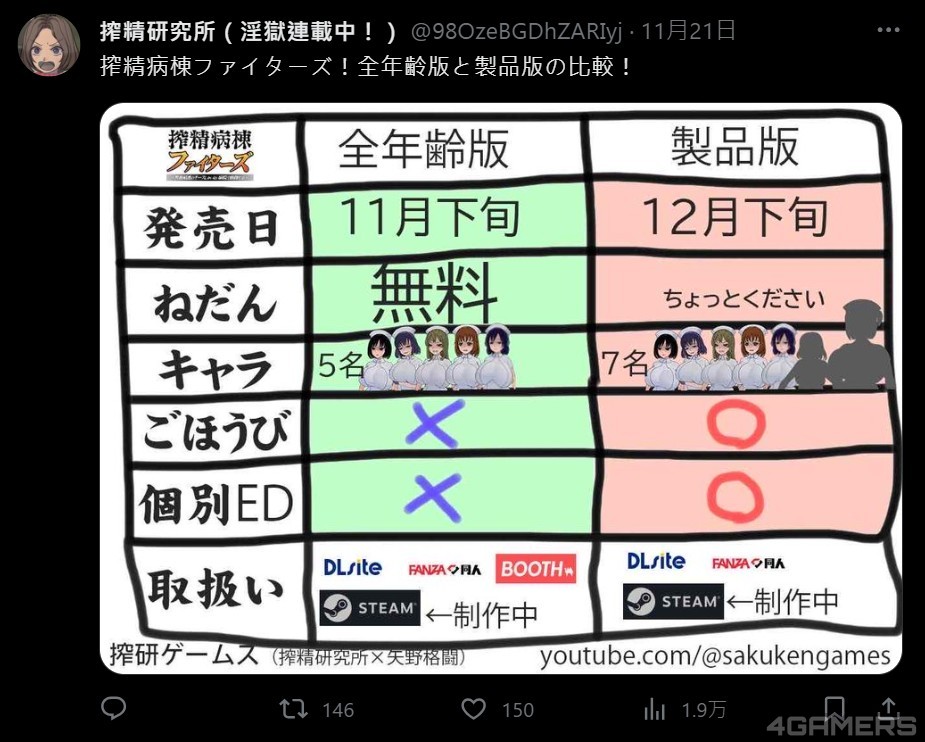 根据搾精研究所 X 公告,《搾精病栋 Fighters》目前提供的免费试玩版为全年龄版本,预计在 12 月下旬推出付费製品版,游戏内容也会增加额外的新的斗士角色,