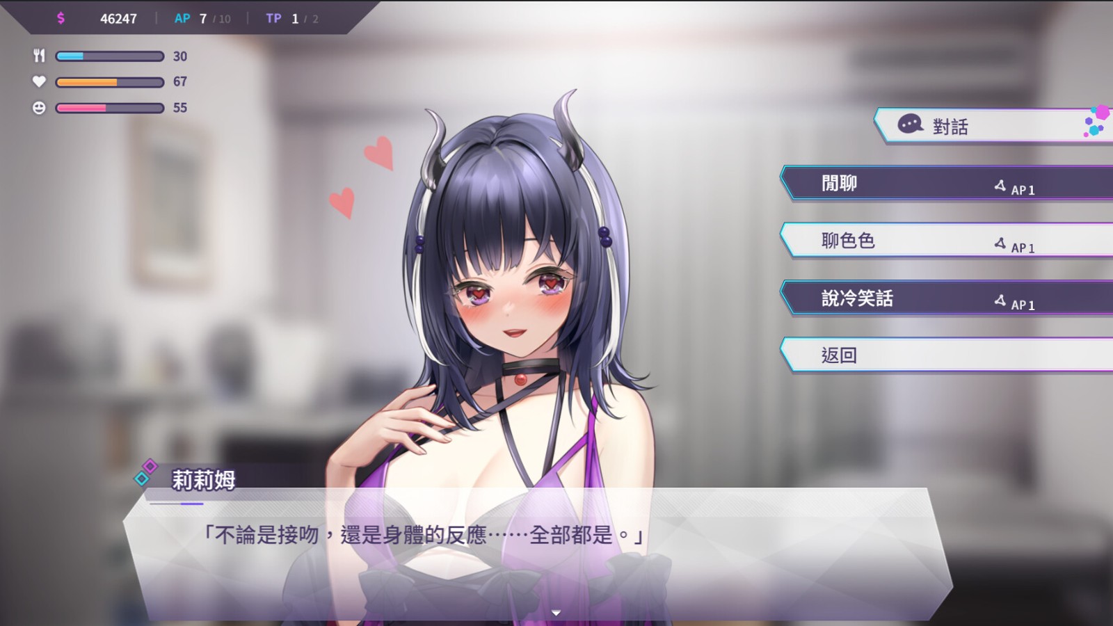 而游戏的进行方式也非常简单明了,在 30 天的时间里,玩家可以从事餵养、聊天、洗澡、购物、睡觉等生活模拟选项,分配时间来增进与莉莉姆的各项数值。