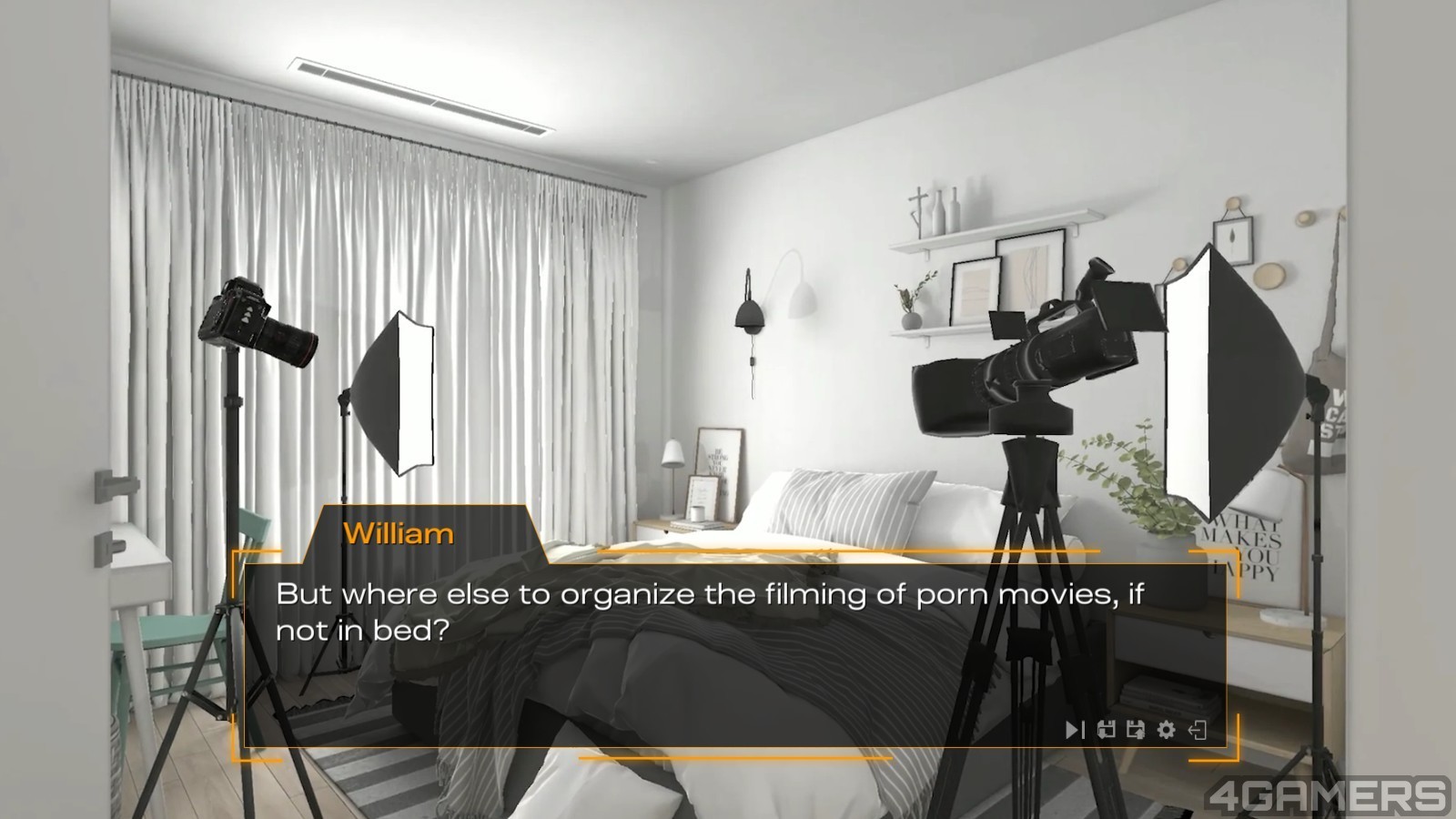 《A Porn Story》主要玩法为视觉小说与成人 H 场景鉴赏,玩家扮演工作室的老闆 William,开场便以倒叙的方式描述 William 自己成功的事业——经营 AV 工作室。