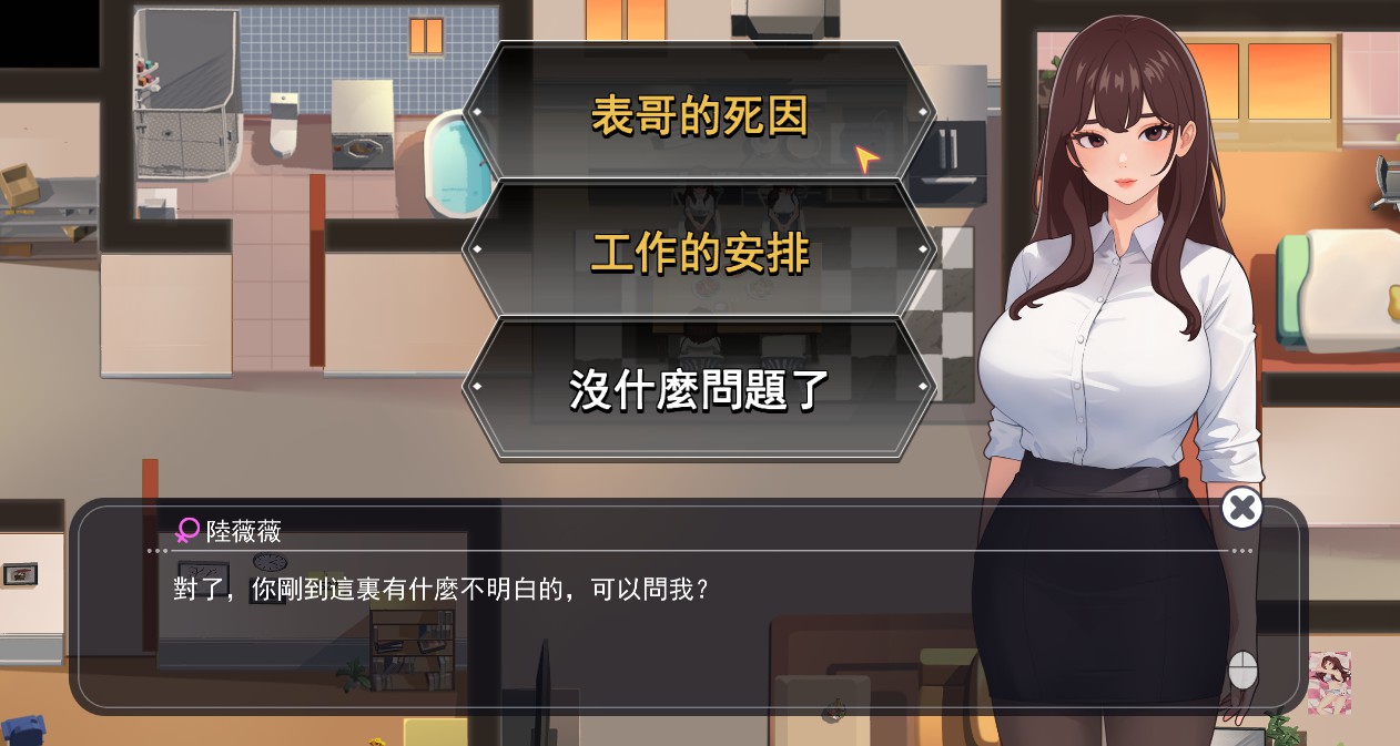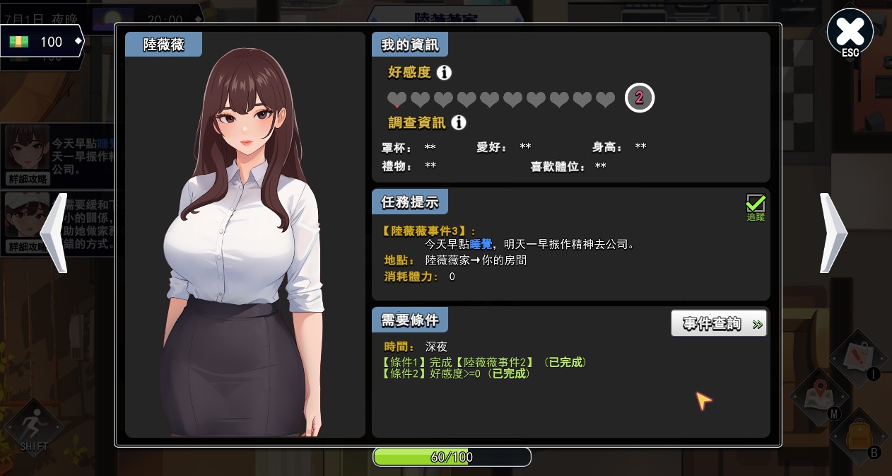 像是玩家一开始没多久即会注意到陆薇薇都比较晚下班,因此在晚间时间前往公司即可触发事件带她回家;或是在下午时间回到家中触发做家事事件,来增进另一位女主角陆小小的亲蜜度。