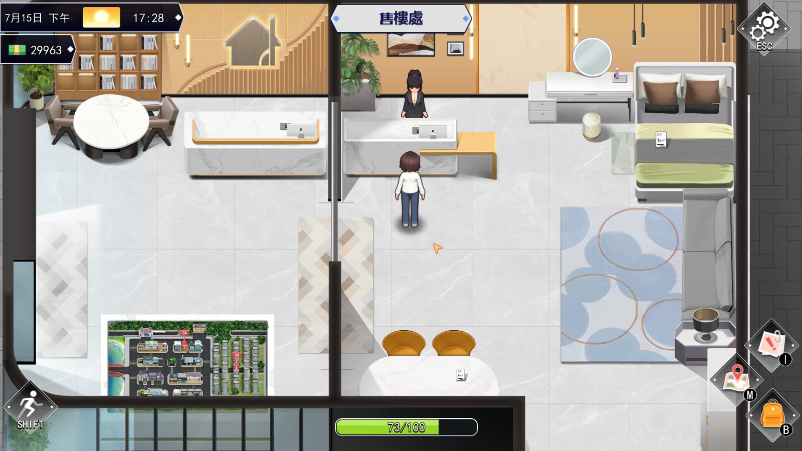 《职场幻想》游戏中共有 5 名女主角可以攻略,玩家所有的行动都以即时消耗时间的方式进行,游戏地图虽然只挶限在小镇上,但有许多商店据点可以探索,走在路上也能捡捡垃圾卖钱,或是透过挖矿、工作、钓鱼、寻宝等管道赚钱。