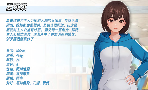 《职场幻想》故事背景描述玩家来到海滨小镇的一家直播公司担任新人,而公司的老闆正是主角那已故表哥的寡妇「陆薇薇」,而玩家则是居住陆家姊妹家中,一边习惯职场新鲜人的生活,一边培养身边女主角们的情感。
