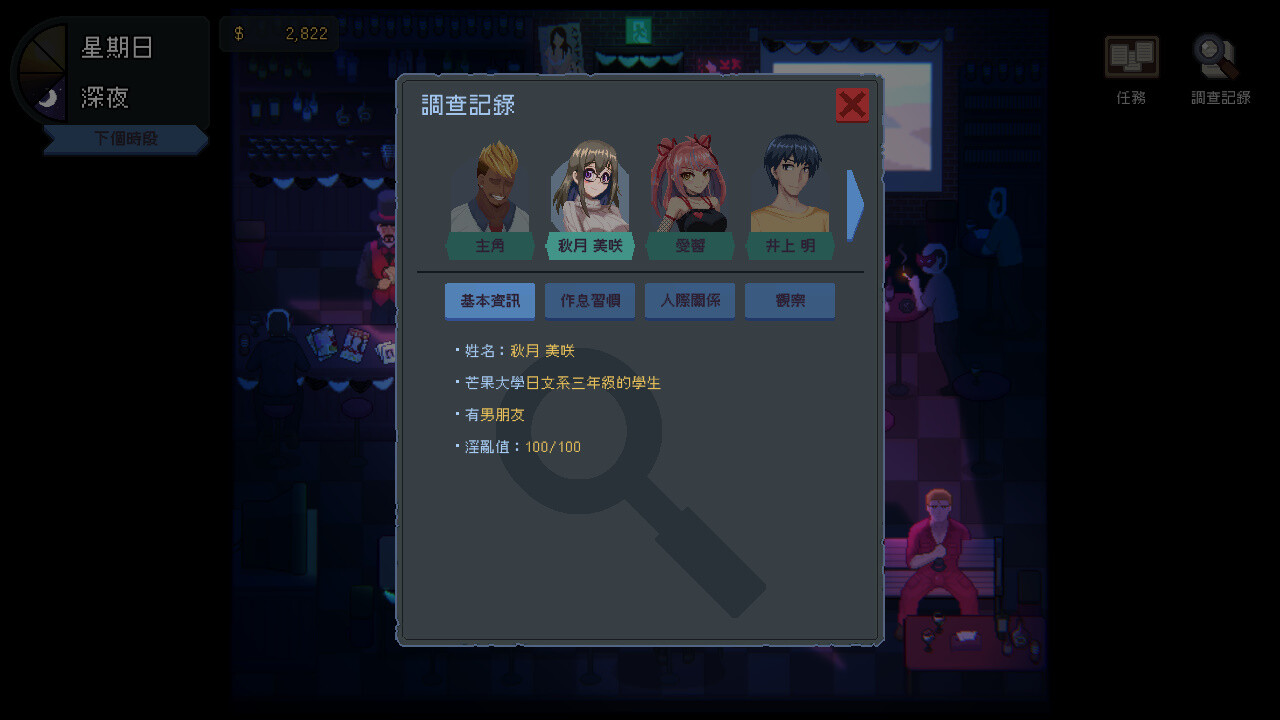 值得一提的是,游戏中还有一个名为「绅士俱乐部」的特殊场所,在那里你能将偷拍照卖给店长,也能与专精「人与人负距离美学」的导师「高和」相遇,以便学习各种技能。