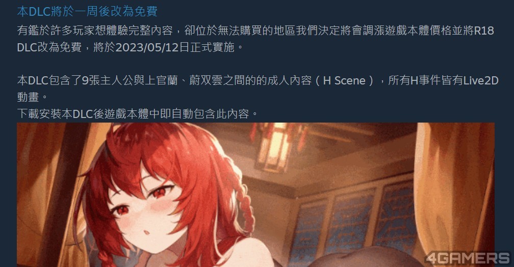 曾发行《幸福的二人房》、《赫雷斯的角斗场》等成人游戏,台湾游戏团队永恆艾莉丝工坊在 4 月底推出旗下最新作品《剑侠‧风尘恋曲》(Blades of Jianghu),并推出额外付费的 R18 DLC,不过经过一个礼拜的玩家反应,官方公告将对售价做出调整——将 R18 DLC 改为免费,并提高本体售价 。