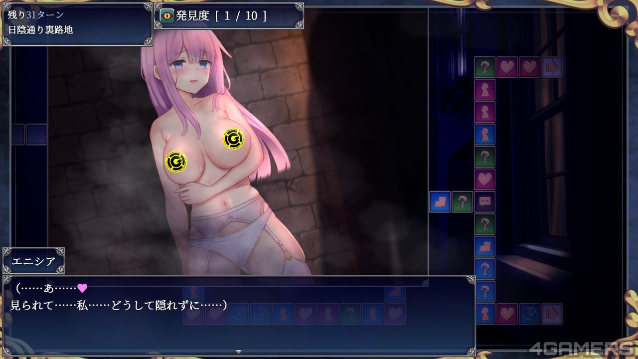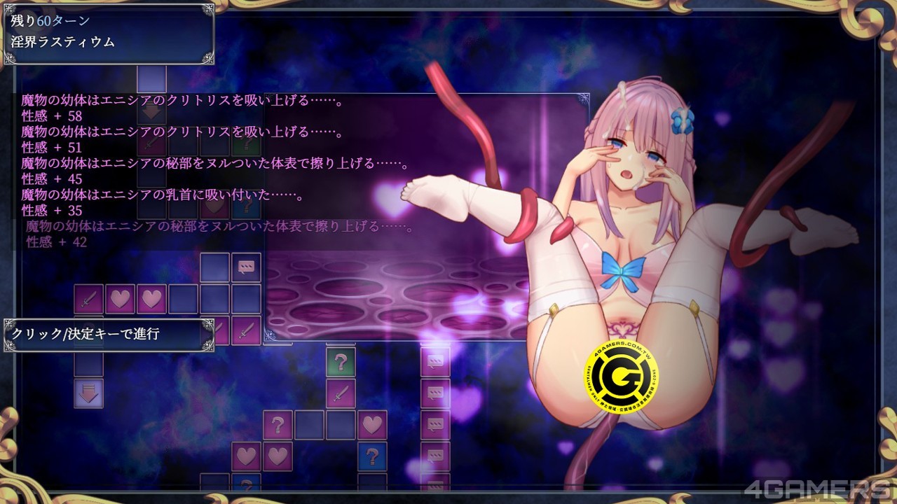 在冒险或是日常活动的同时,「艾妮西亚」有意无意之间会受到性方面的刺激,例如说地城出现的催淫瓦斯,老是喜欢掀裙子的正太,喝醉毛手毛脚或是灌妳酒的酒店客人,以及晚上会出现的痴汉。