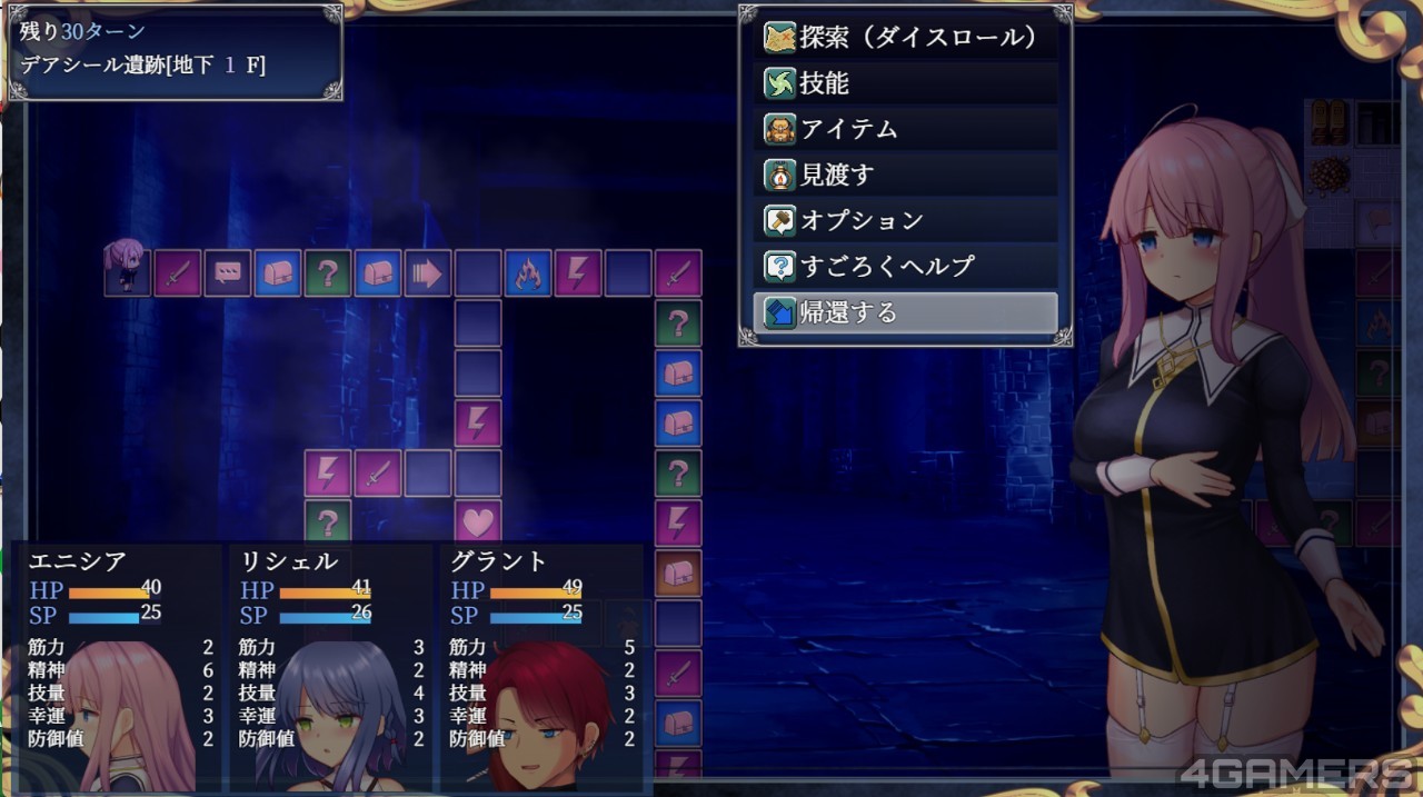 随着每次走到的格子内容不同,玩家会遭遇到各种或好或坏的事件,例如找到宝箱(但是打不打得开要看队员的技量值加上骰子),或是踩到陷阱(能不能躲过也是要看骰子),被冒险队员性骚扰,或是遇上敌人开打等等。