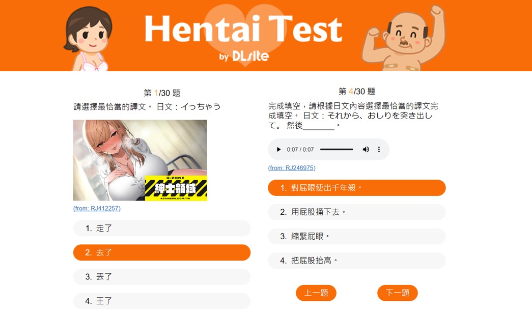 DLsite 在 2022 年起推出了「大家来翻译」作品平台,本质上是邀请熟稔日文的网友加入平台翻译成繁中作品并获得销售分润,而官方在 3 月底时推出了象徵变态力测试的「Hentai Test」近日在网路上流传开来,只要答完 30 题问题即可获得优惠券,也能曝晒你的变态力。