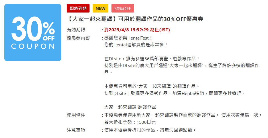 至于获得的优惠券则仅可使用于翻译作品,虽然实用度可能不高,且期限只到 4 月 8 日,但看得出 DLsite 官方仍希望尽可能推动在地翻译市场的努力。