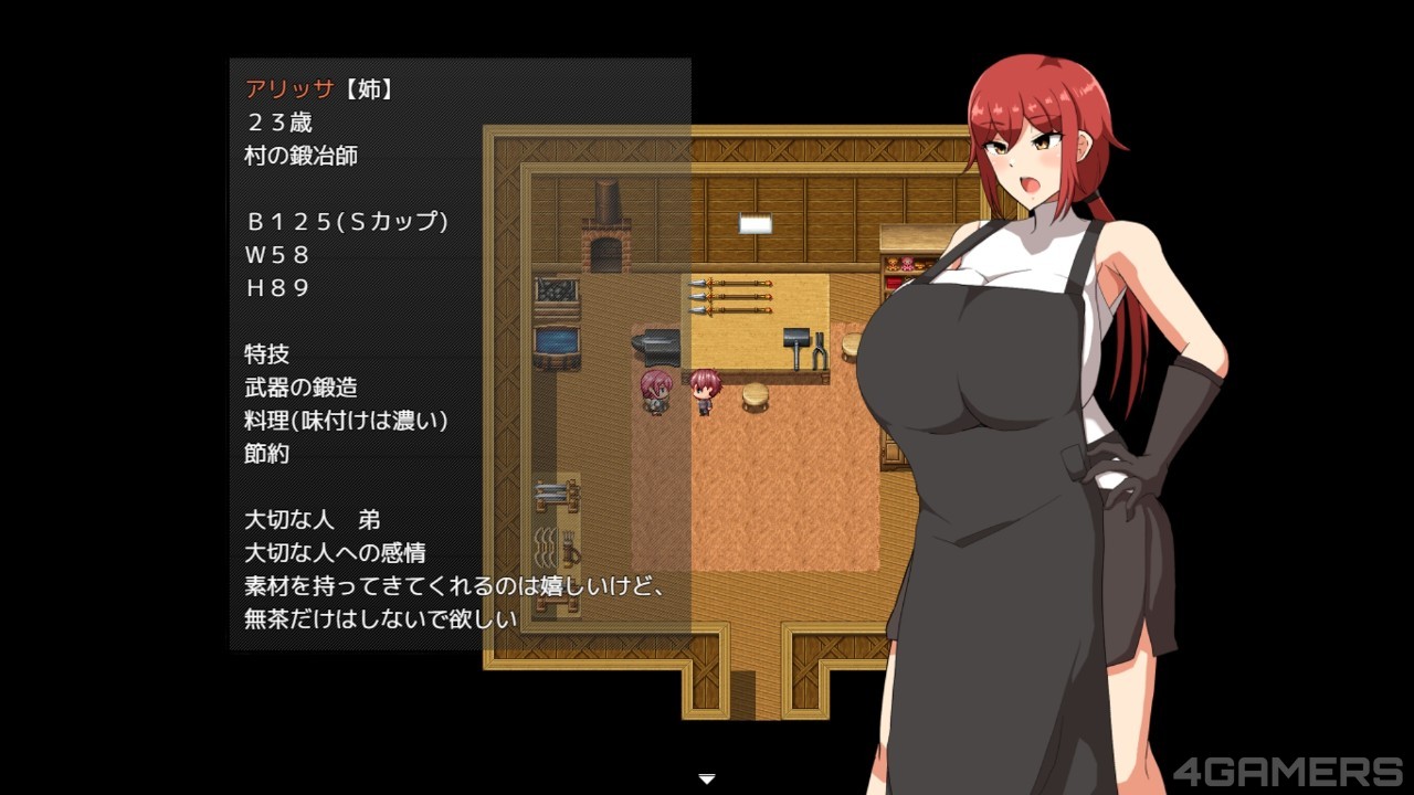 本作剧情上,遥远边境的小村落中,有一对姊弟,姊姊亚莉莎(アリッサ)每天为了在王都中开设锻冶店的梦想努力奋斗,个性开朗,最喜欢的人是弟弟,游戏中的起始设定是对性事一无所知的纯洁处女。
