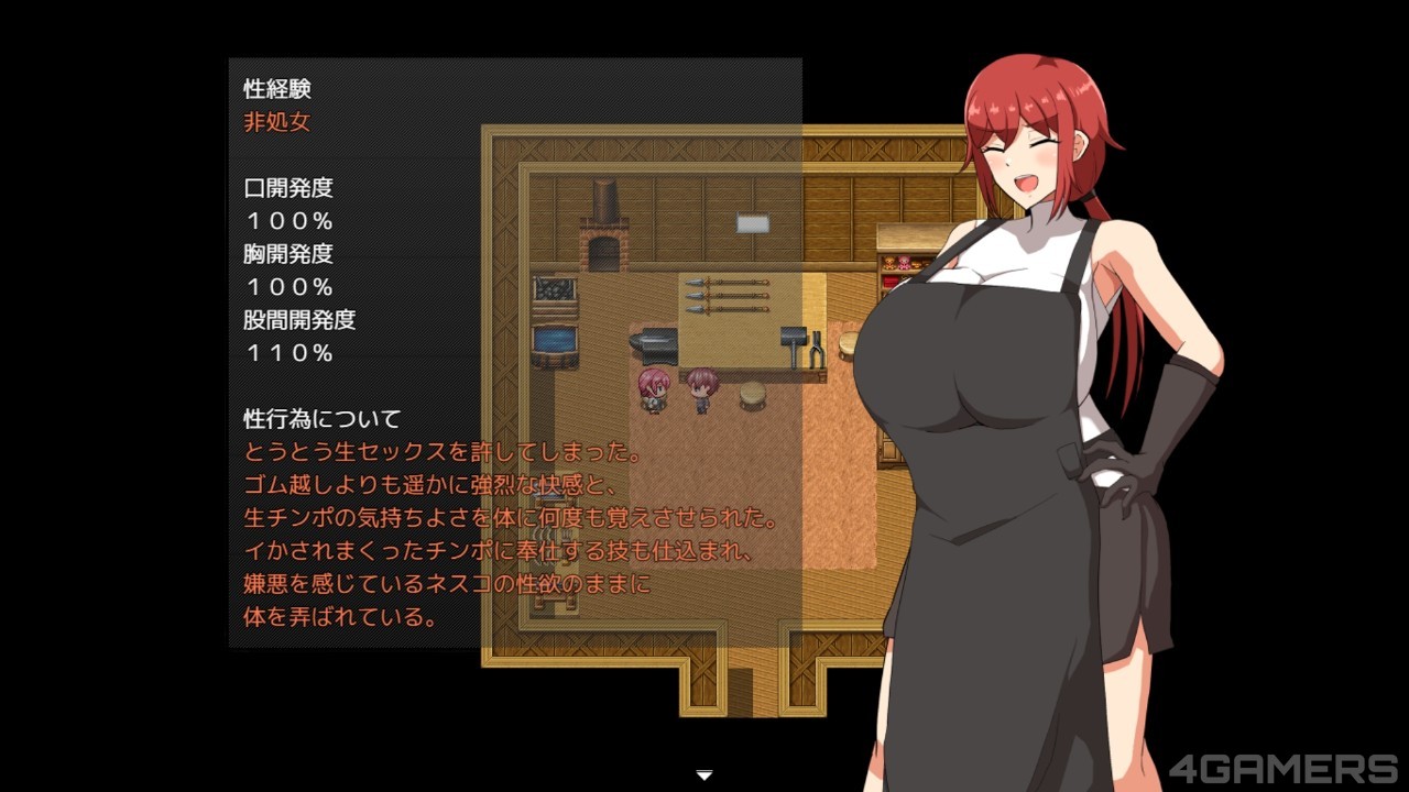 某些剧情线中还有 40 路寡妇村长的 H 事件,徐娘半老的村长有着比亚莉莎还要大的 T 罩杯,丈夫早逝后她一直压抑着性慾,在被进攻后性慾爆发,要把她失去的青春连本带利弥补回来。虽然演出事件量没有非常多,但也有很好的气氛转换效果。