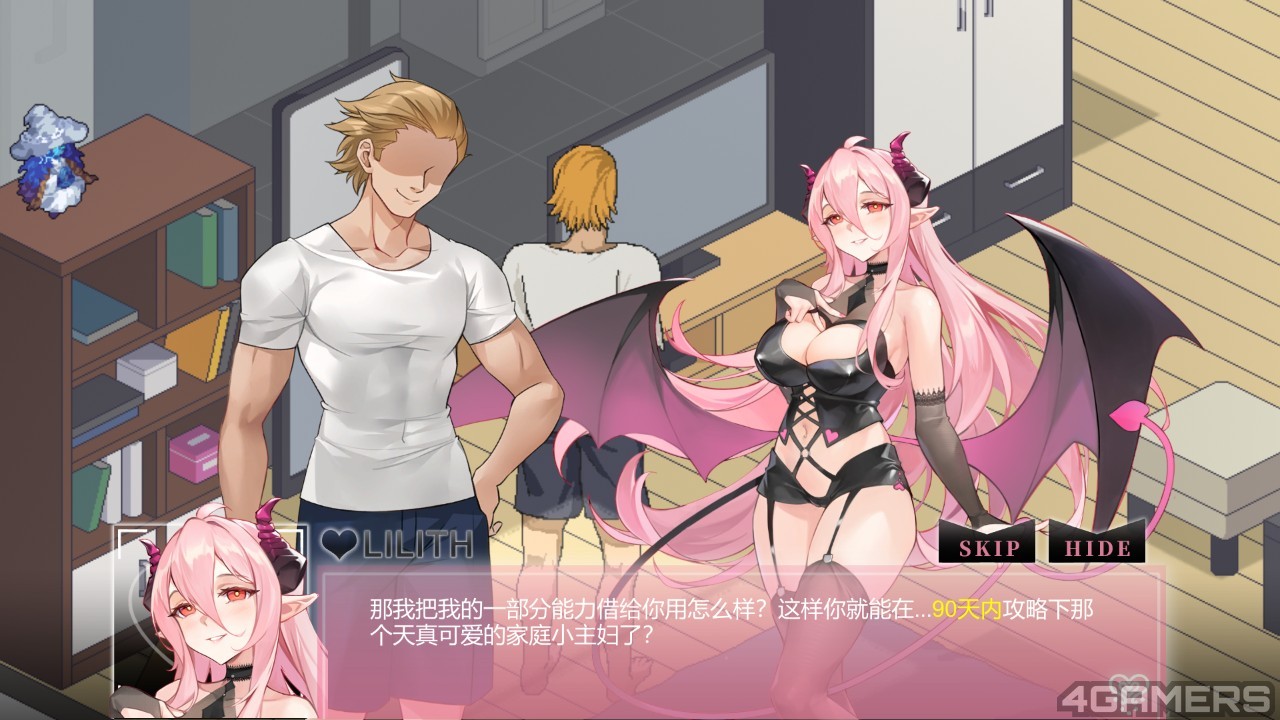 虽然接下来,绅士们都知道会发生什幺事,不过《NTRaholic》却神来一笔地为龙之介增添了一位魅魔盟友「莉莉丝」,她给予龙之介各种特殊能力期望在 90 天攻陷千穗,藉此来满足魅魔需要的堕落能量,否则便夺去龙之介的灵魂,让玩家的行动过程更具明确的目的性与条件限制。