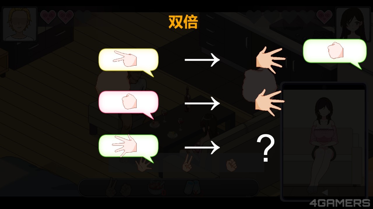 值得一提的是,猜拳提示并不明确,简单来说,注意每一局千穗猜拳的窗格颜色,黄色框代表千穗实际会出克制的猜拳,例如黄色框出剪刀,等于千穗实际会出石头,因此你必须出布才能获胜。