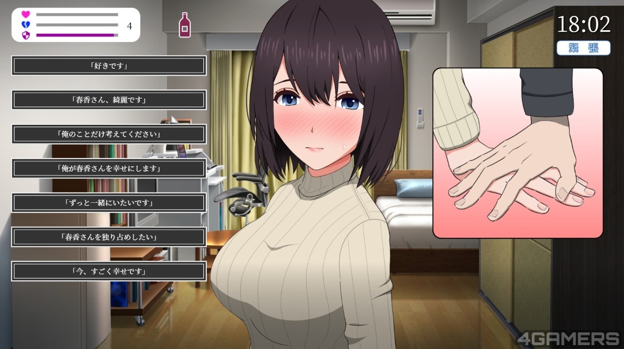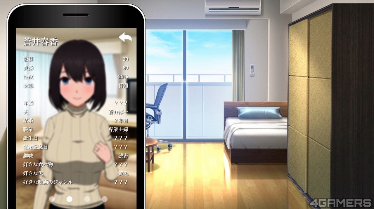 是的,《迟开的蓝色春天》之所以畅销,正是因为这并不是清枪拔作,与一般成人游戏的节奏不同,你必须认真了解苍井太太的一切,她喜欢的颜色、食物、电影类型、以及她的生日等资讯,就算是倒个垃圾碰触她的手,也会微幅影响着苍井太太的数值,操之过及甚至会让爱慕度下降。