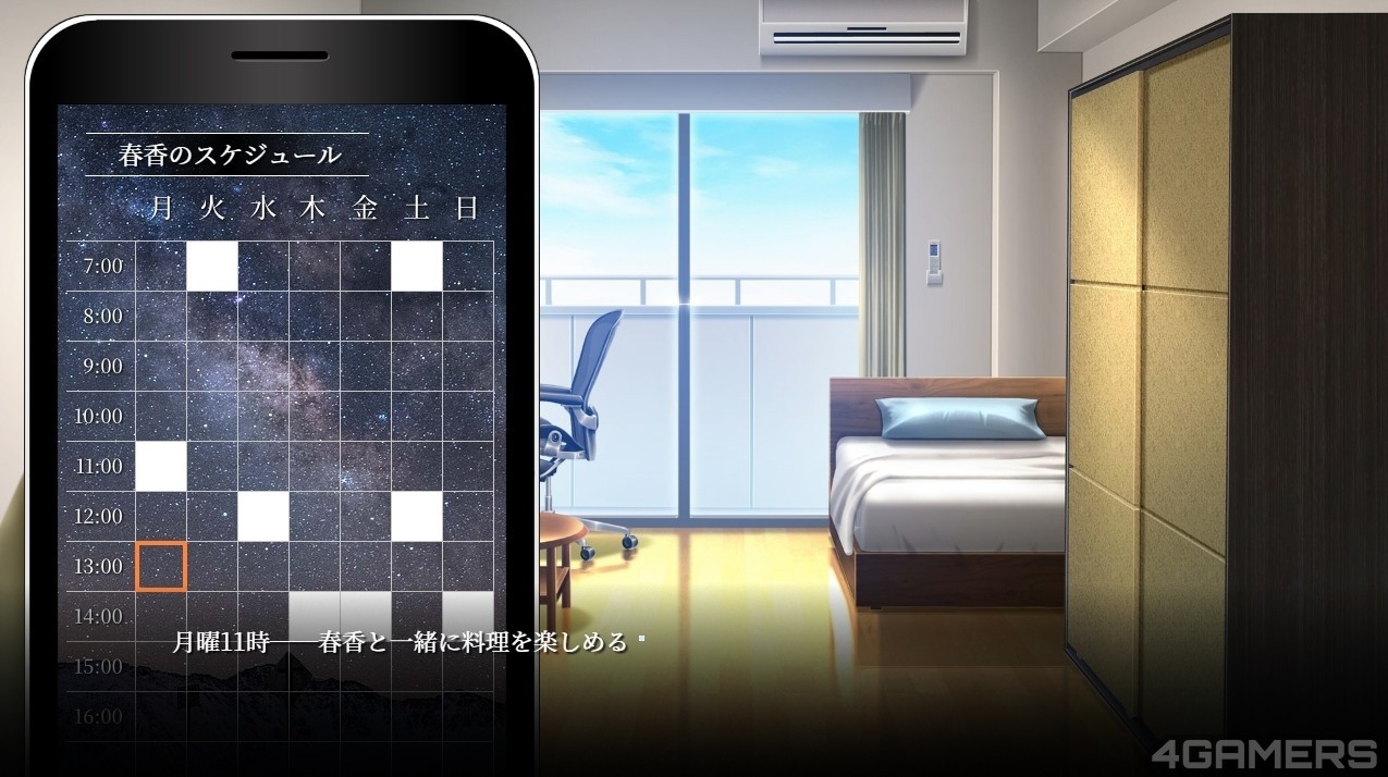 在朝朝暮暮的相处下,玩家也会掌握苍井先生的行动,例如他平日晚上 9 点才会回家,而星期五(金曜日)固定会有重要会议而不定时晚归,这些都成了主角日后偷情的重要情报。