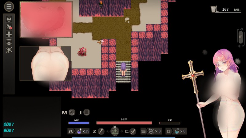在治癒使不断被触手攻击而感受到性高潮的愉悦后,逐渐升起的淫慾,还能让她习得可恢复 MP 的「自慰」技能。