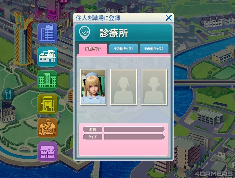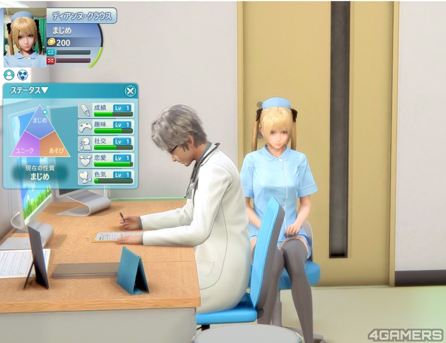 这些角色被安排在特定地点后就会配合设定性格开始进行自己该做的事情,例如说是认真上班,翘班打混,或是做很多意想不到的事情,分别对应角色的三大特性,例如说下图这个长得很像马莉○丝的护士小姐,就是认真上班的设定。